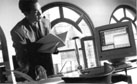 na svom radnom stolu od hrastovine listati Enciklopediju