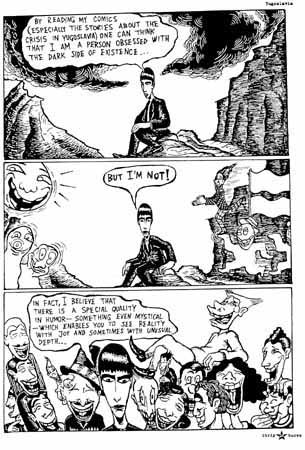 | Strip je u vecini post-socijalistickih drzava u zacetku, sto se vidi i po malom broju autora iz nekih zemalja u Stripbureku (Albanija, Litvanija, Makedonija, Ukrajina - po jedan, Bosna i Hercegovina i Madjarska - dva, Ceska i Rusija - po tri autora); to je ocito i iz tekstova/izvestaja o stanju u pomenutim drzavama (mada su neki izvestaci preterivali u dokazivanju postojanja tradicije i velike perspektive svojih scena). Mnogo je verovatnije da su tamosnji umetnici zbunjeni i zateceni novim medijem i njegovim mogucnostima koje izlaze iz okvira klasicne likovne umetnosti i literature. Razudjenost strip-scena u drzavama sa tradicijom (Hrvatska, Slovenija, Jugoslavija) zavisi od ekonomske moci koja odredjuje postojanje i brojnost strip-izdanja, magazina, albuma i sl, ili - kad taj element izostane, od entuzijazma i dovitljivosti samih umetnika koji u sopstvenoj reziji (dakle u andergraund maniru) objavljuju svoje radove. Primer gotovo fanaticne vezanosti za strip upravo je segment posvecen Jugoslaviji, u kome je predstavljeno 13 autora koji su zauzeli trecinu sadrzaja Stripbureka iako je situacija u kojoj rade daleko od normale. |  |
