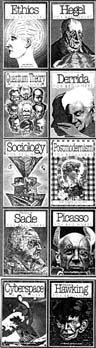 antikvarnu vrednost. Ukljucene u ediciju, koju je smislio urednik Ricard Apinjanezi, te tri knjige kolosalnih licnosti modernog doba upotpunjene su izazovninim eklektickim stapanjem pristupa i razmisljanja. |  | Bez digresija, primeri povezivanja reci i stvorene slike, na pozitivisticki nacin usmeravaju duhovite pretrage i uvide. Podela izmedju pisaca teksta i autora slikovne pripovesti kroz delovanje odredjene licnosti ili pojave u vecini knjiga ispunjena je efektnim predstavljanjima tekstovima univerzitetskih strucnjaka ili pisaca i jednako, primenjenim ilustratorskim resenjima na nacin graficke novele. Imajuci umnogome posao svodjenja i demonstracije apstraktnijih ideja ili asocijativnih povezivanja, mnogi ilustratori i strip crtaci - kakav je uz Apinjanezija, jedan od inicijatora edicije - Oskar Zarate (izmedju ostalih naslova, odgovoran za vizuelnu stranu Frojda, Lenjina, Kvantne teorije i Makijavelija) - pribegli su efektnom prelamanju svake stranice kao posebne epizode objasnjenja, stvarajuci pregledna polja u parametrima brze jezgrovite informacije. |
